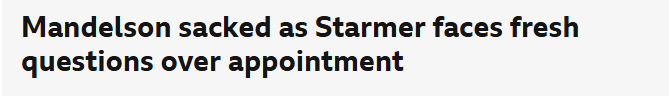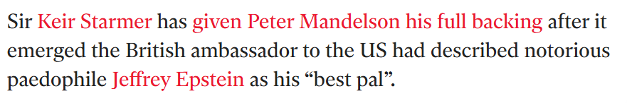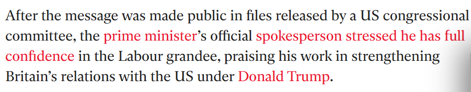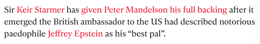What a farce. 2 days ago he had his full support. Then sacked him. 😆 https://www.independent.co.uk/news/uk/politics/starmer-mandelson-epstein-ghislaine-maxwell-b2823128.html What a clown show.