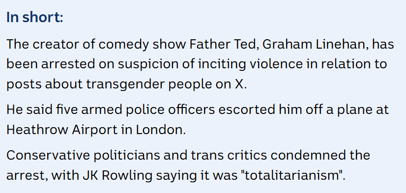1. Exactly. When 5 armed police arrest you on arrival, for a tweet, you know it's all gone terribly wrong. https://www.abc.net.au/news/2025-09-03/graham-linehan-arrested-transgender-posts-on-x/105728142