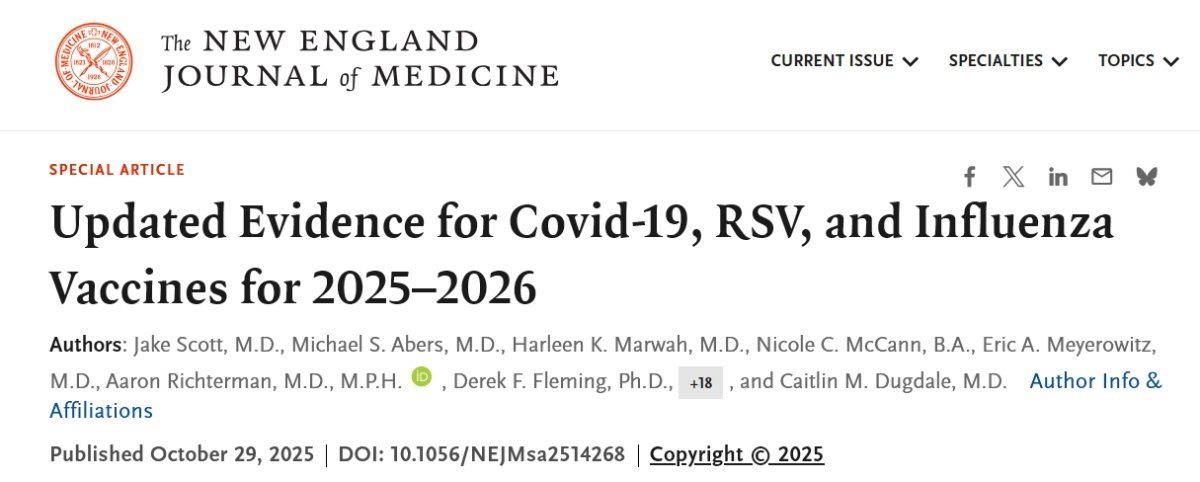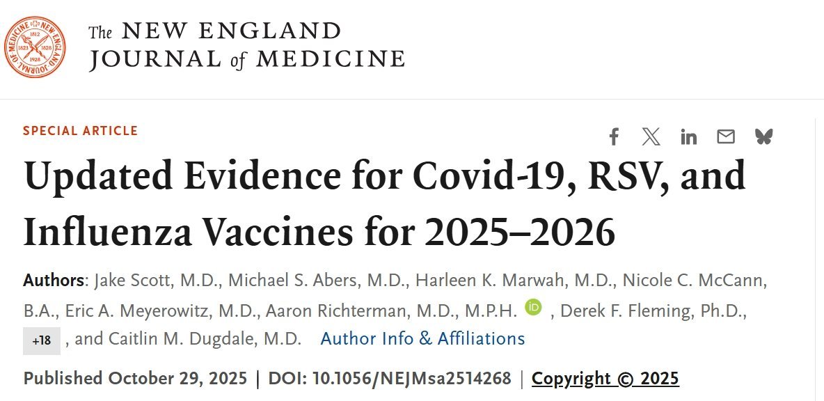 ... "Updated findings reaffirm that immunizations are associated with a substantial reduction in the risk of severe outcomes across populations, with only infrequent reports of key severe vaccine-related safety events, such as myocarditis and Guillain–Barré syndrome. Although effectiveness estimates of approximately 40% against hospitalization in some populations (e.g., Covid-19 vaccines in immunocompromised persons and influenza vaccines in adults) may appear to be modest, they still represent substantial reductions in severe outcomes at the population level and are similar to the efficacy and effectiveness of influenza vaccines that was seen during the past 15 years.145 ... Immunizations against Covid-19, RSV, and influenza have shown consistent effectiveness and safety and are associated with a substantially reduced risk of hospitalization and severe disease across populations. These findings underscore the enduring value of immunization against respiratory viruses as a cornerstone of preventive care and support the feasibility of maintaining rigorous, evidence-based guidance during periods of institutional disruption." (more) https://www.nejm.org/doi/full/10.1056/NEJMsa2514268