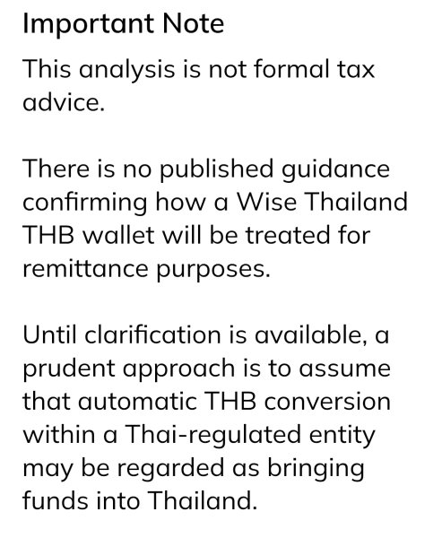 This is absolutely terrible news. I'm making two reasonable assumptions: Wise users will no longer be allowed to directly transfer into and out of multiple currency accounts, and any money placed into Wise will count as a remittance under Thai income tax laws. Frustratingly, the linked page does not clearly state this but it is implied with everything else they write. None of this will be relevant to pensioners simply transferring income to Thailand or people with simple lifestyles occasionally transferring money outside of Thailand. I'm talking to people who have global financial interests. Most expats with serious funds will follow the standard practice of A to B to C: citizenship of A, bank savings/investments in B, living in C. This minimises tax implications. One of the major functions of Wise is to act as a global bridging mechanism. That is, to move money from A to B or from B to A using local access accounts. But with these changes it appears that Wise will force the money to go via C (since the auto-conversion to Thai baht is likely to count as a remittance in law), creating a huge tax liability and creating a double conversion charge. You might suggest that the expat should simply use a competitor to Wise such as TorFX. But that will not work because most financial institutions require that your money is withdrawn to an account in your name. And for whatever reason only the "virtual" accounts of Wise are accepted (e.g. it is currently remarkably easy to set up a Singapore bank account with Wise, which is widely recognised by financial institutions). Other competitors do have virtual accounts which you can open various countries but they are simply not recognised by the financial institutions. Running various scenarios through Gemini AI, I found the cost implications to this Wise change to be unbelievable. I strongly recommend others in this position take a look. Not only will you be charged for a double conversion of the money but you will also be hit with an income tax bill on it (30%+ of the sum transferred?). There are no viable FinTech alternatives to Wise for these global bridging mechanisms. I think the only choice is to open a premier/priority bank account such as with HSBC or Standard Chartered or Citibank etc. I'm interested to hear how other people are handling this. (I think for the basic user of Thai resident Wise the access to a wise card and being able to transfer out of Thailand will be mostly beneficial.)