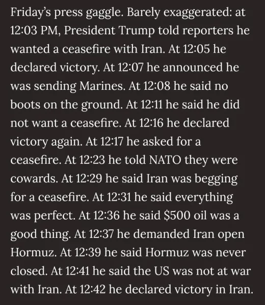 ”Markets don’t trade on truth, they trade on beauty,” Alpert said, invoking John Maynard Keynes’ theory of the stock market as a kind of beauty pageant. (For anyone who, like me, snoozed through that chapter in Econ 101, the short version is: In 1936, Keynes imagined a contest in which a newspaper ran 100 photos of faces and readers were asked to pick the six prettiest. Whichever reader picked the six most popular would win the contest. The lesson is: The best strategy isn’t to pick your own personal favorites but rather those you think other people will favor.) “If you’re trading markets, as opposed to investing, you’re focused on what other people think, what they’re likely to do,” Alpert said. “You may not think it’s good, and you may not even be sure it’s a lie, you just think that everybody else is going to think it’s good, and so you pile in with your order … When you’ve made enough money, you dump it, and that’s it, end of trade.” https://edition.cnn.com/2026/03/23/business/wall-street-markets-reaction-trump