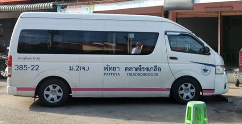 This picture is from an FB post of 2023. Company doing mini van from Pattaya to Talat Rong Kluea (Kloeu). That's the big market at the border in Aranyaprathet. They claim to do a trip every 40 minutes from 4 AM to 5 PM. It's bus line no 385. Don't be confused by the hilarious transcript on the buses (Cholburi, Taladrongglior )