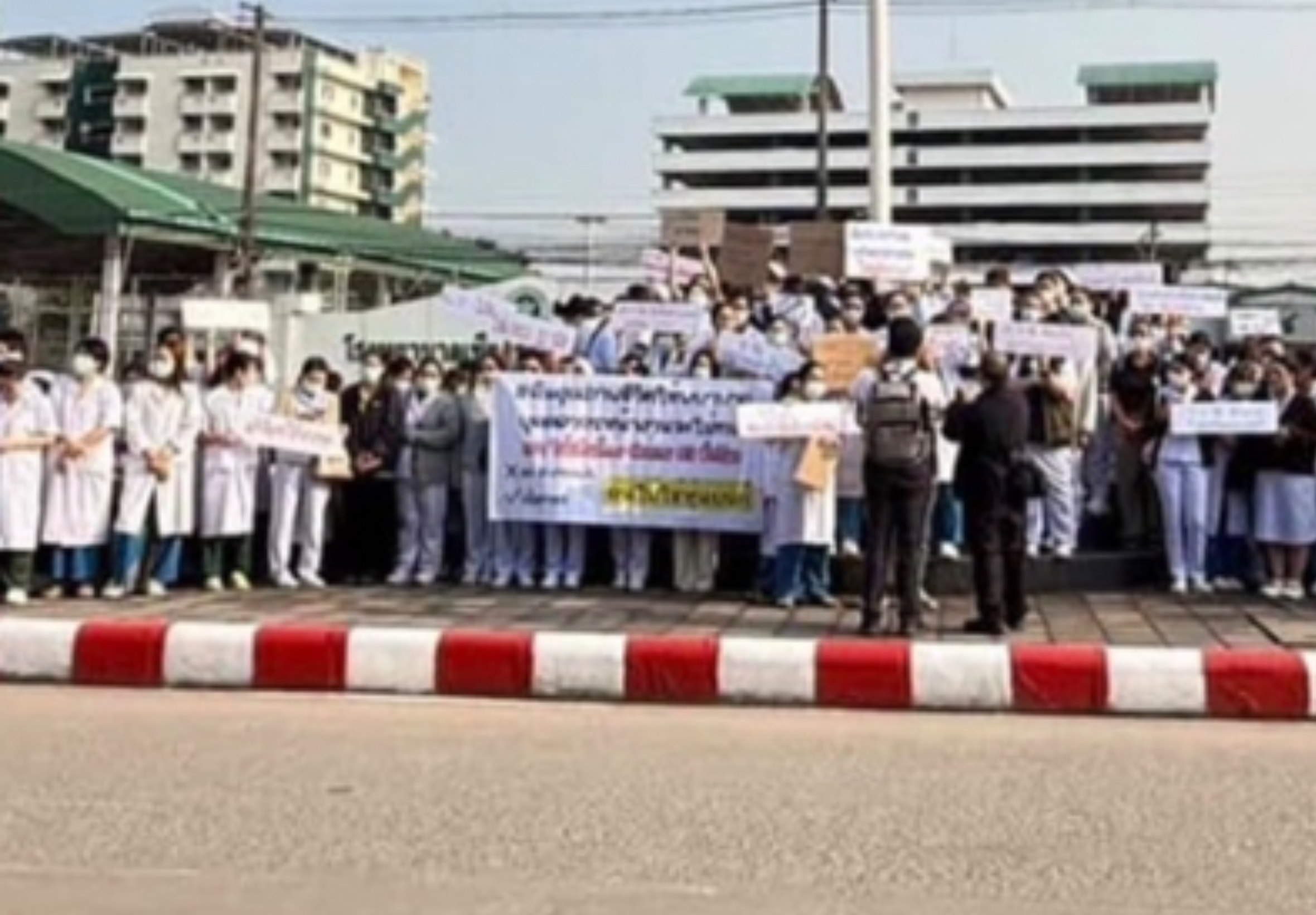 Around 200 nurses and medical personnel gathered on the morning of 16 March 2026 at the flagpole courtyard of Chiang Rai Prachanukroh Hospital in Muang district, Chiang Rai, to protest a new policy requiring 12-hour work shifts. Demonstrators held placards with messages including “People are not robots”, “Return quality of life to nurses”, “Frontline staff will not tolerate this”, and “We do not want 12-hour shifts”. The protest reflected concerns that extended working hours could lead to fatigue and compromise patient safety.
