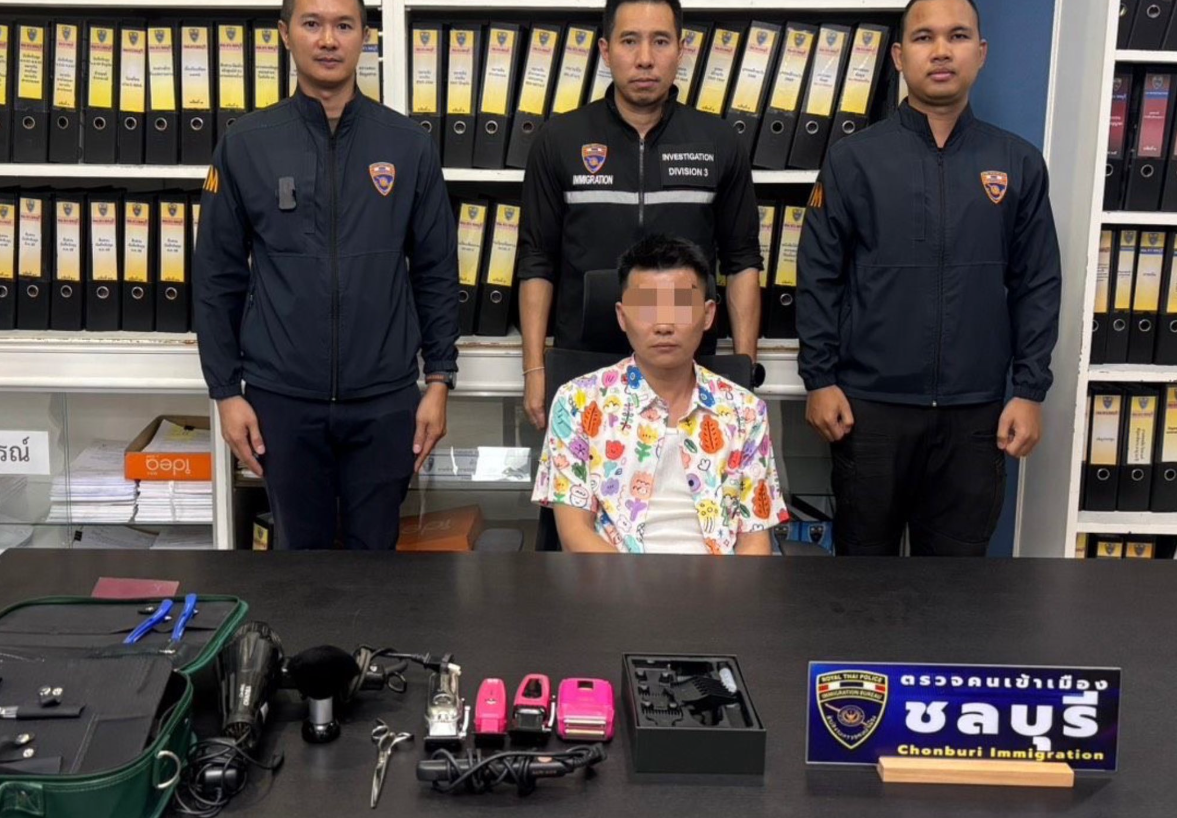 Investigators had received intelligence that a Chinese man was offering hair-cutting services to fellow nationals. Officers then set up surveillance at an office located at 146/152 Sukhumvit Road. Upon arrival, they found the suspect actively providing a haircut inside the premises, with three to four customers waiting.