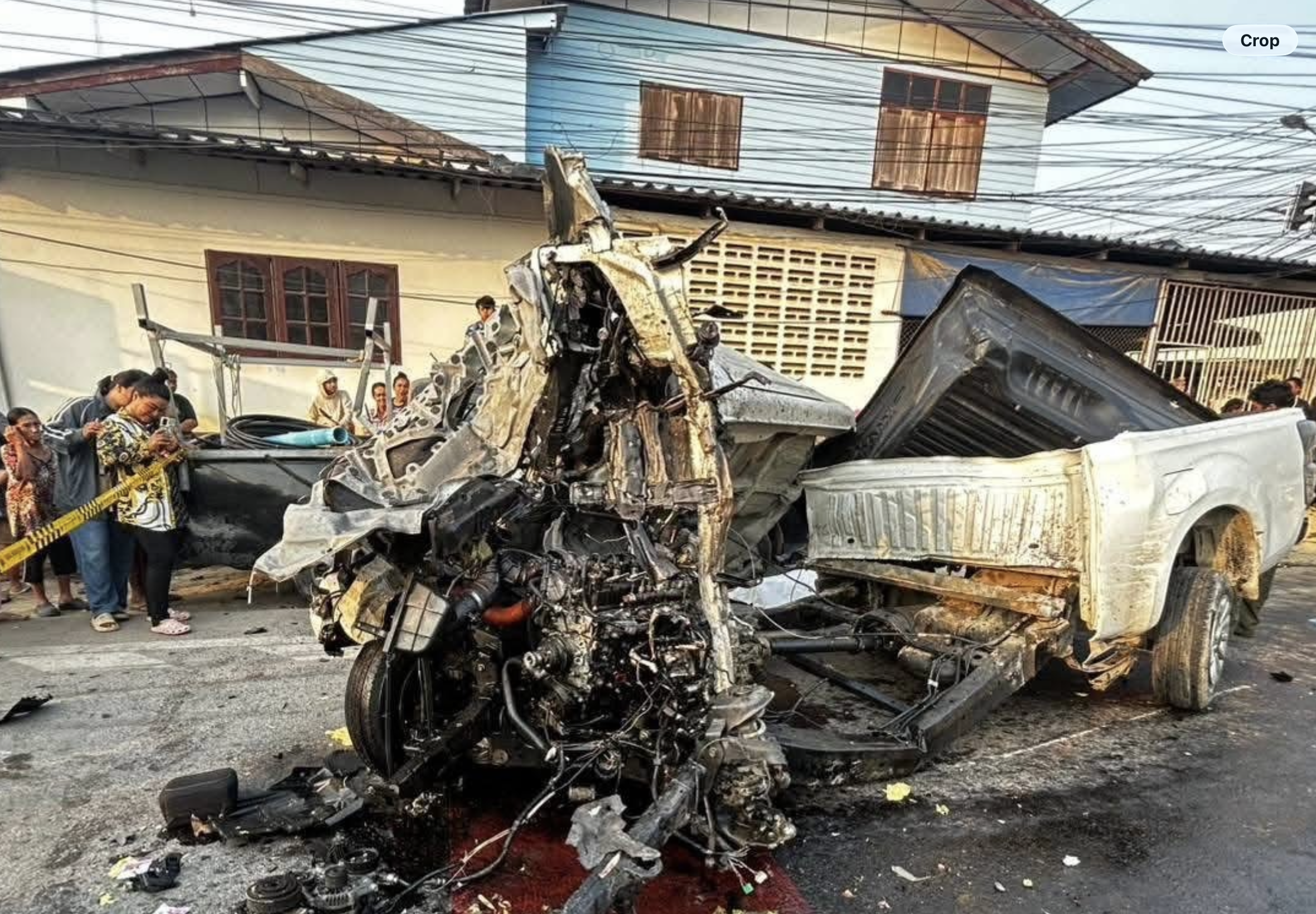 Three vehicles were damaged. The white Isuzu D-Max was completely destroyed. A black Toyota Vigo pickup, registration from Bangkok, parked beside its owner’s home at the junction, sustained damage to both driver’s side doors and a grey Isuzu D-Max, registration from Chainat, was damaged at the rear of its cargo bed, being lightly struck while crossing the junction.