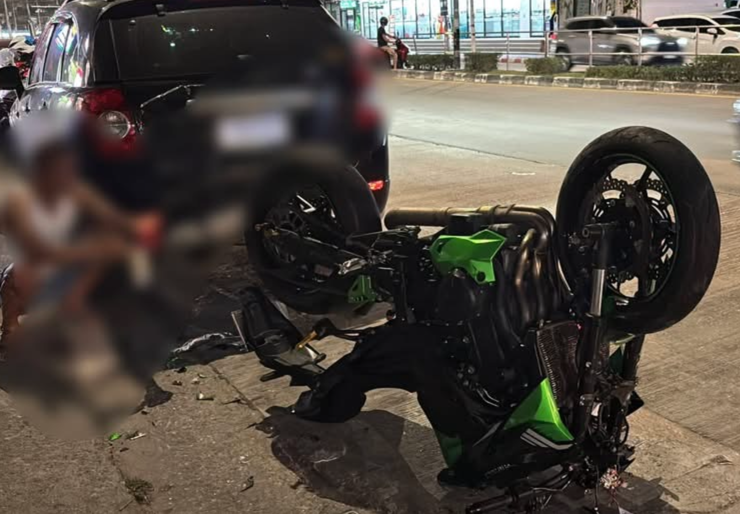 Police located the wreckage of a green Kawasaki Z800 motorcycle some distance from the point of impact. The vehicle, bearing Chonburi registration, was damaged and found overturned after skidding into a parked car, causing further damage.
