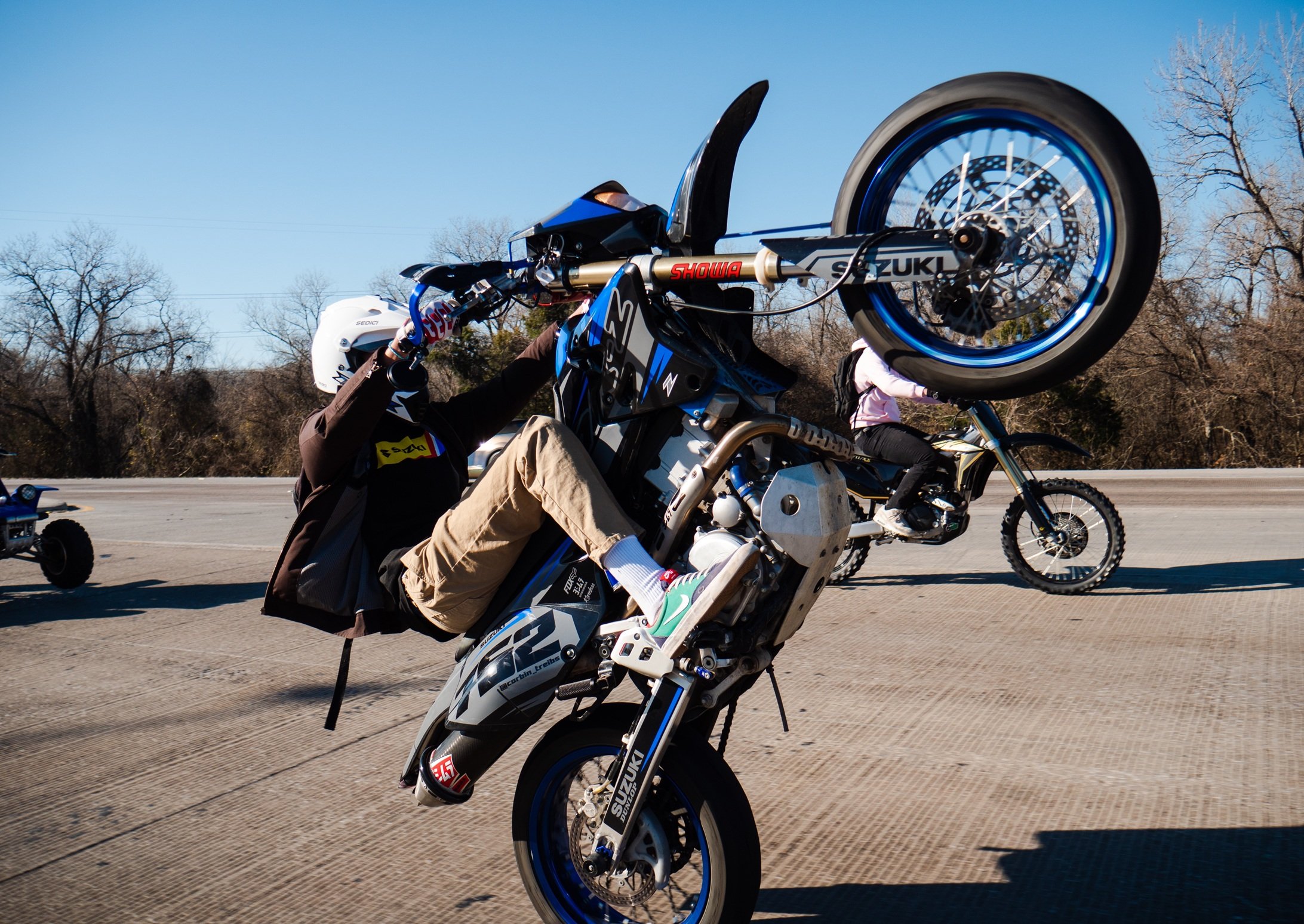 The stunts reportedly took place at 10:27 near a Lotus’s supermarket. Witnesses saw one man repeatedly performing wheelies, alarming nearby motorists. Police identified the motorcycles involved — a red-blue Honda CRF 450R and a Yamaha MT-07 — and later found them outside a convenience store on the same road.