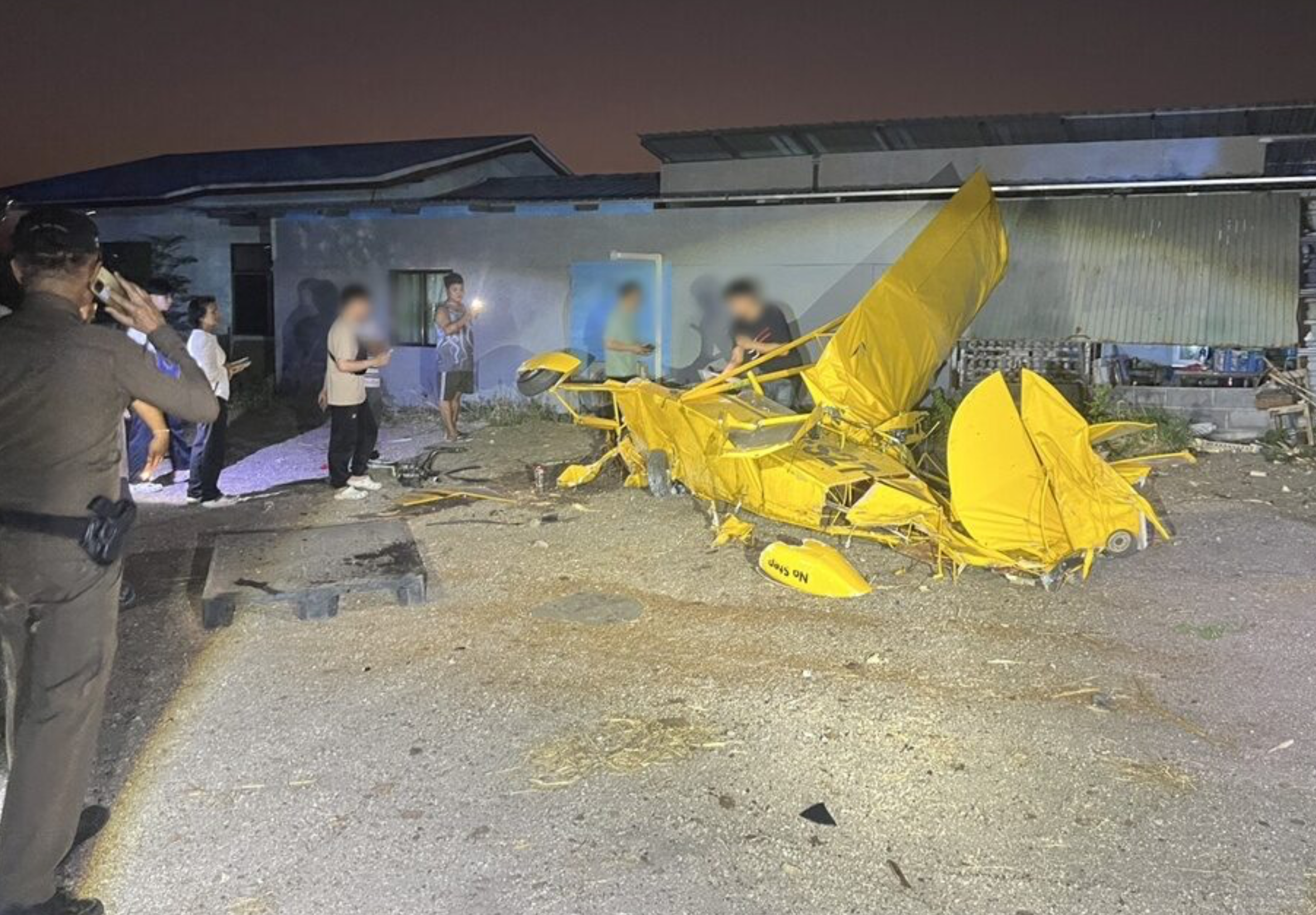Police from Phra Phutthabat station were alerted to the crash at around 6.30pm after local residents reported that a small plane had come down near a shop along a road in Village 2, Soi 6, in Than Kasem subdistrict. Officers led by Pol Lt Col Saman Phuwiphak and Pol Col Weerawut Damsuwan arrived with rescue volunteers from the Ruamkatanyu Foundation to investigate the scene.