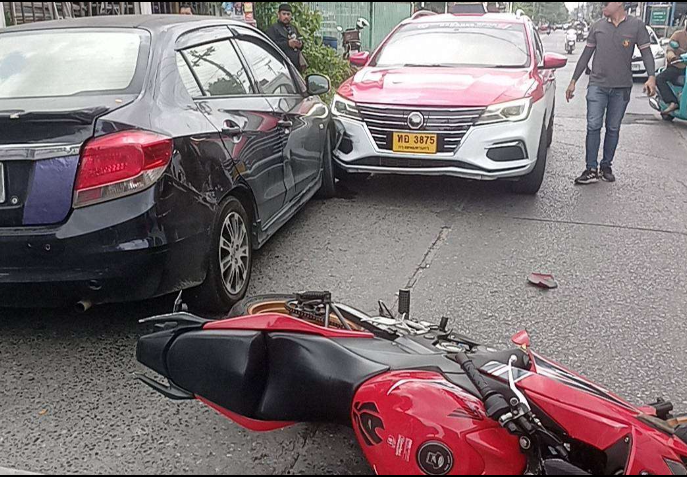 Police were alerted at 14:30 to a collision in Soi Sahakorn 3, heading towards Tiwanon Road in Bang Phut, Pak Kret district. Officers and volunteers from the Ruamkatanyu Foundation arrived to find a pink-and-white MG taxi, registered in Bangkok, had collided with a Honda car, registration from Bangkok, and a red Honda CBR 150 motorcycle, registration also from Bangkok. All vehicles sustained damage, with the motorcycle rendered undriveable due to a broken front suspension.
