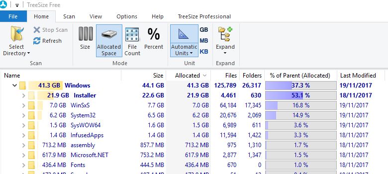I did a quick scan of folders in Windows folder and it seems the hidden Installer folder and then WinSxS are main culprits taking up nearly 70% of my 44GB Windows folders!