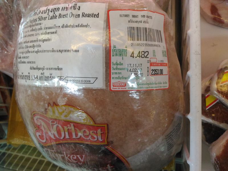 She showed me that they had exactly ONE frozen, fully cooked Norbest turkey breast at 525b per kilo in their small freezer section along with ONE Thai turkey. And from her description, it sounded like she didn't expect to be getting any more than that.