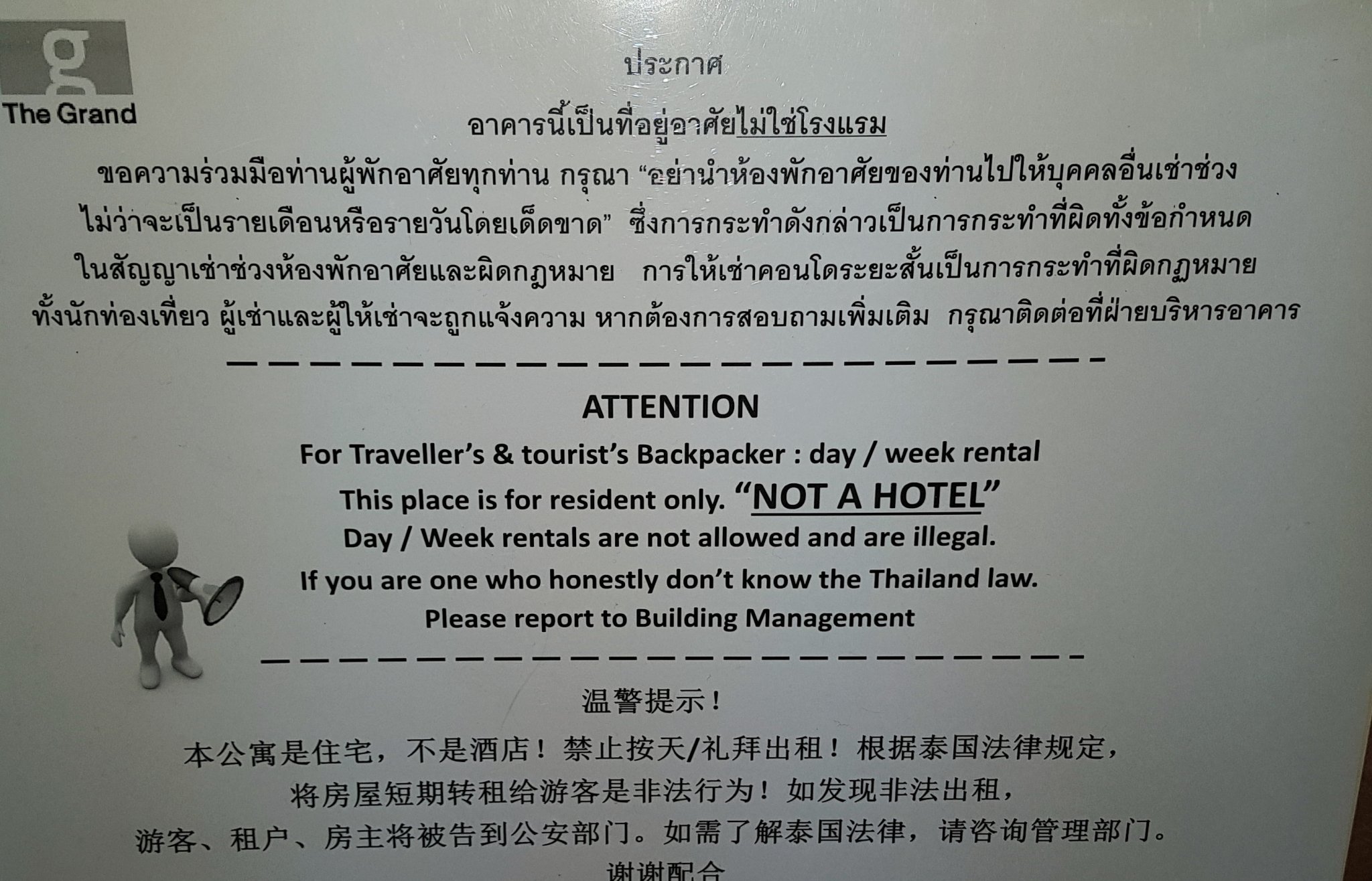 January 25, 20188 yr 11 minutes ago, ThaiBob said: Last year, a friend who occupies his condo at Jomtien Condotel (enter by Pan Pan) reported a swarm of Immigration agents performed a similar check at his condo. Until Immigration and Revenue departments start comparing notes, and identity and fine non-compliance individuals for not paying taxes these abuses of the law will continue. There are simple short-term solutions such as requiring condos to post signs in the lifts, on each floor, in the lobby, in agents offices, that it is illegal to rent a condo unit for less than 30 days. When I lived at Centric it had signs posted everywhere saying short-term rentals are illegal. As a resident, it was nice to see the law publicized with the signs but I doubt it stopped many of the illegal rentals--by the time the illegal renters read the signs they were already checked in. Centric doesn't seem to have cracked down on the illegal rentals and, apparently, now is even doing the Immigration registration. If you are cracking down, you don't make the process easier.
