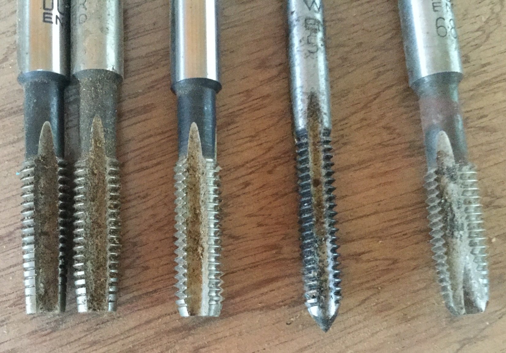 The first hole I tried to tap, but really needed to drill it first as the tap wouldn't really start. The composite metal that I was tapping into is fairly hard. On the bench with a larger wrench would have been OK I think.