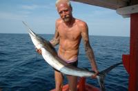 February 26, 200719 yr Finally got the spare engine part I needed on the 23rd. Took ages cos the shop in Bkk was closed for the chinese new year. Fishing has been fantastic since then. Afternoon of 23rd nice marlin and a couple of tuna. Yesterday out with 2 customers, Johnny and Tina from Sweden. Johnny really wanted a marlin but it didn't happen. He got a bull dolphin, 6.4k mack on the livies and dozens of smaller fish on the feathers. This morning another dolphin and a much bigger marlin. Tomorrow Johnny and Tina are out again. Tina has already taken some great photos of the dolphin and hopefully tomorrow we can nail that marlin.I'll post the photos up so those of you who can't get out fishing can enjoy. Very interesting yesterday how many boats were out netting the plaa thuu. Never seen so many, so much for closed season. Today the military ship was anchored outside Sairee and no netters to be seen! Have you been out much Womble - any luck? Thinking about it now should be a good time to catch big pelagics, I know people say November is the best time, but it is now that the Pla Tu arrive in Ang Thong region, surely the bigger stuff follows. So it makes perfect sense that there are Marlin around. Unfortunatley the water around Samui is too shallow, nearest point here to get a chance at Marlin would be sail rock which is a fair distance away. Marine park is also very shallow, there should be sailfish there, but it's too shallow for Marlin. I know for a fact marine park is full of queenfish and Mackerel, also net fishing is not allowed there, only fishing with rod and line is allowed. I think the marine park is one of the best protected areas of water in Thailand unfortunatley I have also heard that a few boats are paying officals to turn a blind eye to illegal fishing practises. I have heard from local Thai's that they expect the fishing to deteriorate there due to the boats taking too many fish. What a shame. I havn't been out fishing for a while, been away for a week fishing somewhere else in Thailand, there's also a small problem with our engine that needs fixing, so might not get out till end of the week. So far we have caught some groupers and a couple of stingray, been bitten off a couple of times, but have yet to land anything over a couple of kilos. Would love to get over to Koh Tao, we can take enough fuel to get there, but it would have to be a flat calm day. Please make sure you take a camera with you on future trips, as i'd love to see some snaps of the marlin. What tuna are you catching, and what size? any YFT? or is it just skipjacks? I've only ever seen very small skipjacks in the market. Also what size was the dorado? Well Johnny got his marlin today. 3 misses and then a hookup on the 4th try, all within 30 minutes late afternoon. Also 5 dolphin and 2 tuna. All fish were small. Tuna to 2k, dolphin 4k and the marlin I guess to be between 15 and 20k. Very nice fight though. It took about 400 meters of 40lb, lots of jumps (some caught by Tina on film) and then near the end of the fight it actually jumped into the boat and poked me. After giving me a bloody shin it flipped back over. Tina got a photo of it about to break the surface as it was about to take revenge. Dolphin were lots of fun on light spinning gear, and at one stage a marlin came chasing under the boat trying to catch a small dolphin. I just wrote a long post about tuna in the gulf but it somehow dissapeared, and too tired to try again now. Going to go after for some macks tomorrow morning, those big live plaa thu should be just the ticket.