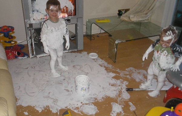 hah, that's great - especially kids with paint all over the place. Did something similare myself when I was young, but it involved large marker and kitchenware, but in any case...it must be hard to know if one shold yell or laugh when seeing ones kids pulling a stunt like this. =)