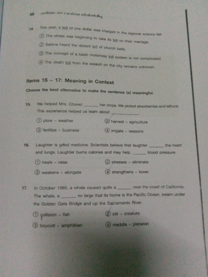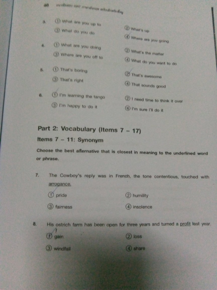 The student gave me this exam. It's an English competition exam (as she said). She confused about the correct answers given by her teacher, so she asked me to give her an explanation of the correct answers for each item, why it's correct. The correct answer is circled by a pencil.
