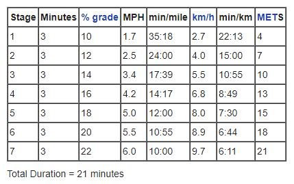 I'm surprised some have said they were told nine minutes for their test. When I checked on the internet I found twelve minutes was the standard target, continuing to 21 minutes if you are able. Google Bruce treadmill protocol if you want to know more but here's the standard test figures in stages. I could have made 15 minutes but the steepness killed me more so than the speed. You're allowed to run. The final stage increases to 9.7kph and to walk that fast on level ground you would have to be very fit so running is what most people do. I can walk 6.5km in an hour on the flat and that I know is faster than many people. Unfortunately no hills where I live.