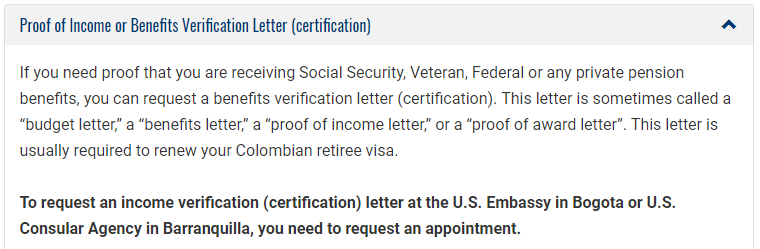 I focused on SS letters because the retirement visas in Colombia and Peru specify the need for government issued retirement pensions. Perhaps they include military pensions too. They should if they don't of course.