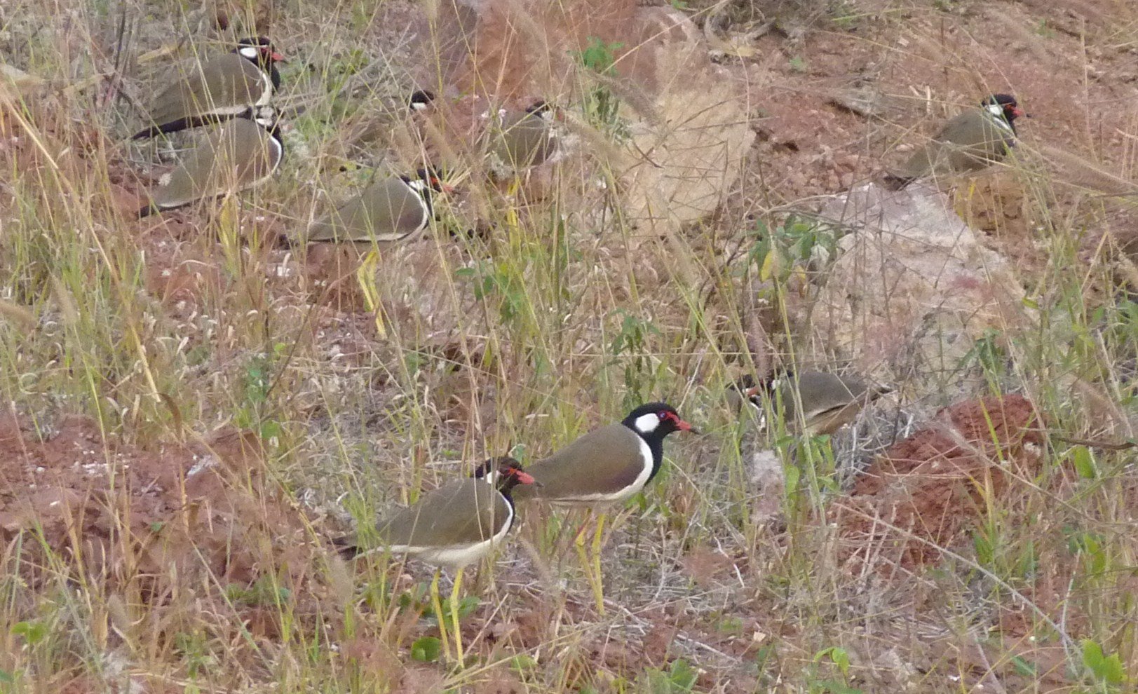 I'm often mobbed by Red Wattled plovers (top) if I wander too close to their nesting sites which are otherwise invisible on that same background.