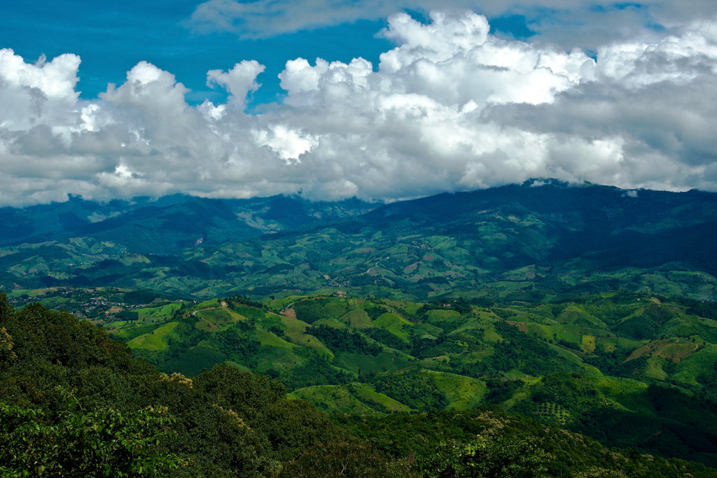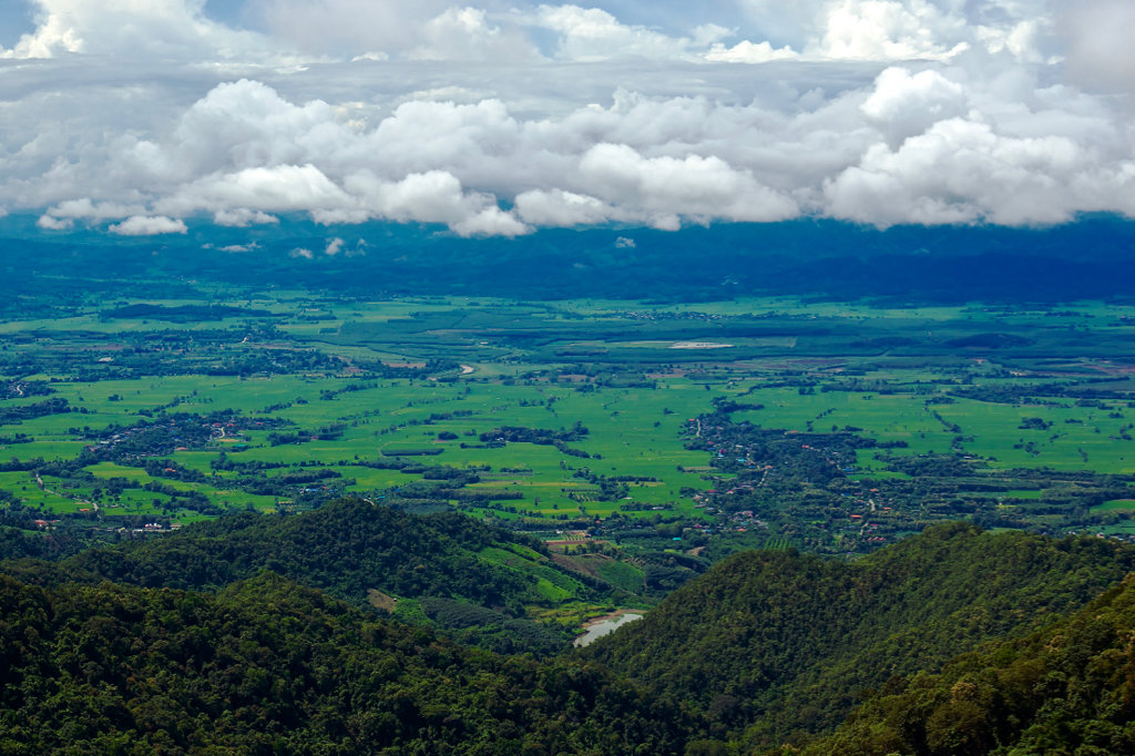 This photo is taken looking West and down on the valley where I live.  Chiang Rai would be behind those clouds.  We live in a village close to the dark green below those clouds but before the rubber plantation.