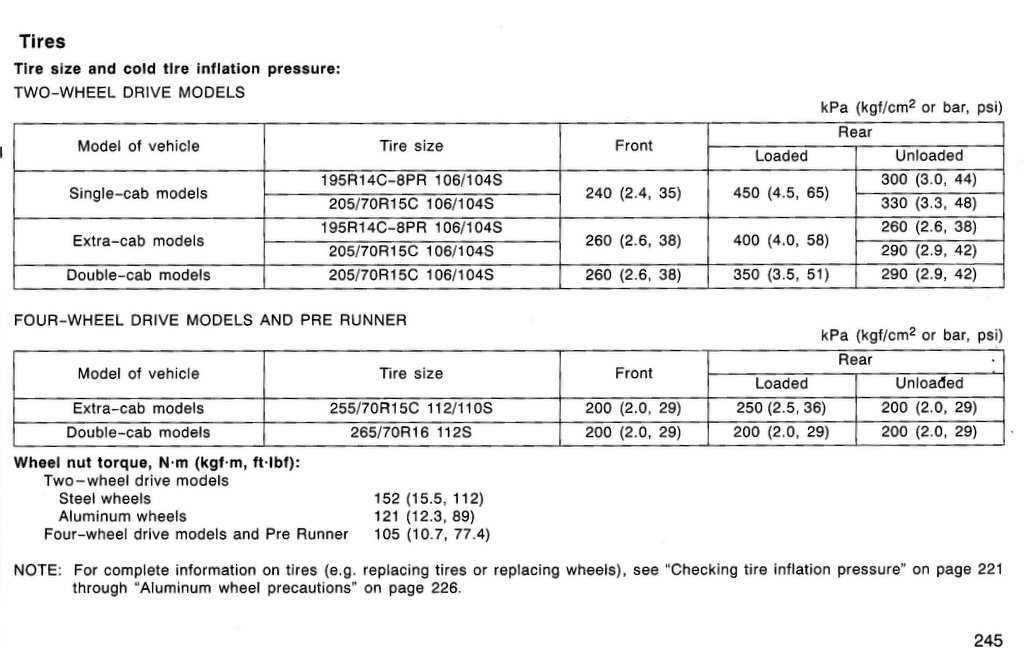Your truck handbook should have the recommended pressures if there's no sticker on the driver's door (our sticker is not visible from farang head height, stooping is required to even see that it's there).