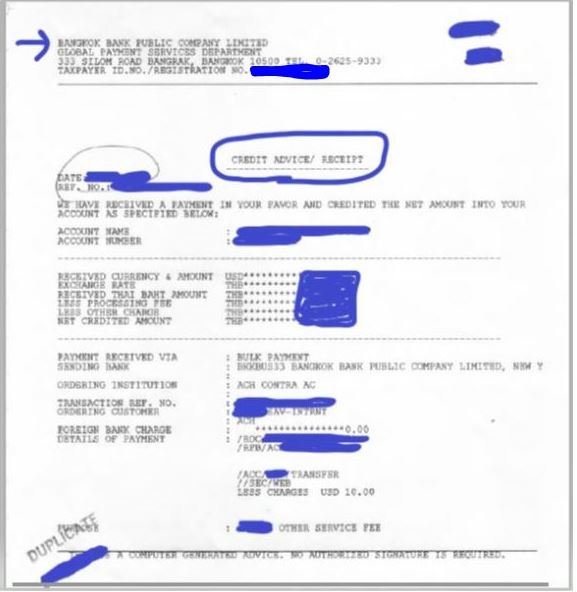 Info on Bangkok Bank Confirming Incoming Monthly Foreign Transfers
