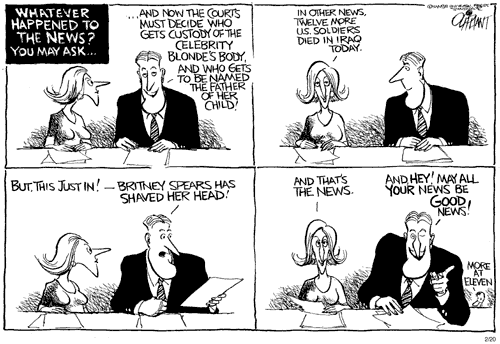 Yep, the real news is getting backburnered these days it seems, and what there is of it is so mangled with political twists it's hardly worthy of a read. I miss the old Intl Herald Trib; the new tone (well, for the past few years) is straight out of the donkey's mouth. Missing reporting that isn't opinionated.
