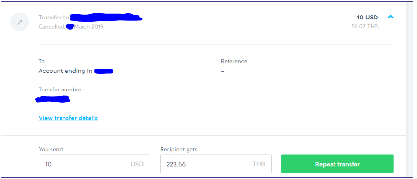 March 21, 20197 yr I just walked thru the 6 step process described above...but modified it a little as described below and as to why. Step 6 was different. Since I never "wire/push" the money to Transferwise as that would require me to Wire funds to them which would cost around $20-$25 USD ballbark depending on person's US bank fee to do a wire transfer. If needing to do that using Transferwise may not be the best/cheapest way to transfer money due to that added fee. Now there will be some folks who have a premium/high net worth account with their bank where they get some domestic/international wires for free but the great majority of folks will be paying a wire fee and may even have to call/fax a doc to initiate a wire...in other cases it can be done online depending on your US bank. Wires in the US are generally not cheap and always can't be done online. Instead, I use an "ACH Debit (Bank)" (not to be confused with Debit Card) which "pulls" the funds from your US bank account for a low TW fee. I expect the great majority of US folks doing a USD-THB use the ACH Debit (Bank) method to fund their transfers. The ACH money transfer system is the main funds transfer system used in the US...the primary method used to move money between banks/individuals/pay bills/govt benefit payments like social security/etc....it's the 800 pound guerrilla of funds transfer systems used in the US So, my modification of the steps was right after completing Step 5 was to stop...not go to the next step of funding the transfer where I pick the funding method....would select ACH Debit (Bank) and fund the transfer that way. Without following thru with the funding step the transfer is basically on-hold pending funding. That is where I would stop and then contact Transferwise with the transfer number and ask for the tagging to occur. Then once getting the confirmation back from Transferwise that the tagging is done....which someone said takes about a day....I would then go back in and fund the transfer using ACH Debit (Bank). Now in this test I had no intention of asking for tag and pay afterwards so I then just cancelled the transfer. With the transfer now cancelled, I wanted to see if it could be brought back to life with the same transfer number....and it couldn't. All that was offered was a green button to "Repeat" the cancelled transfer which just starts a "new" transfer using the same basic info as in the cancelled transfer although you can change amount to be sent, etc., but it's a new transfer...will have a new transfer number. No green button offered to Pay in a cancelled transaction for me...only a Repeat Transfer green button. See below. So, at least for my account/Transferwise accounts registered as a US account step 1-5 work as described, but do not Cancel the transfer. Instead, stop after Step 5, contact Transferwise to tag the transfer, and then once getting it tagged then complete the funding process where you could then do the ACH Debit (Bank) funding.