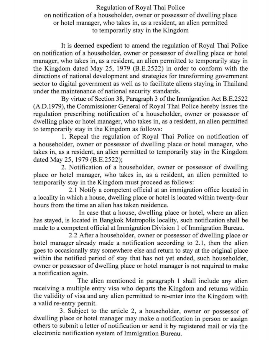 Under Article 37, any foreigner residing in Thailand who visits another province for more than 24 hours must report to immigration.