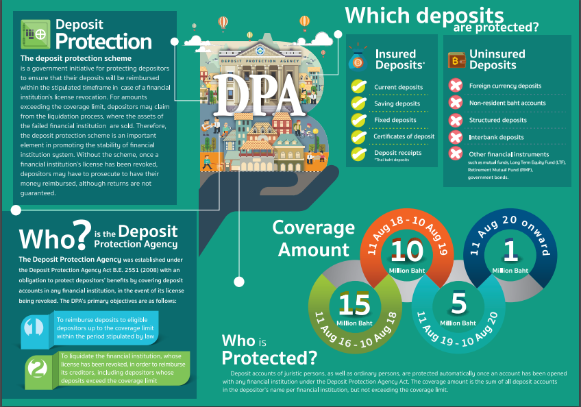 Coverage amounts for protection of deposits has been reduced by half, from Bt10 million to Bt5 million per account per financial institution starting August 11, the government’s Deposit Protection Agency (DPA) said.