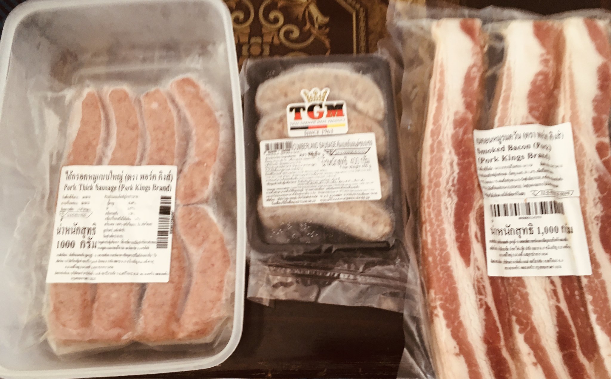 After years of searching i have found a perfect English style Pork Sausage. It must be a new line at MAKRO. Comes in a clear packet and can be found in the upright freezers. Bht 200 per pack.  Devine , much better than all that TG <deleted> or the garlic infested Thai sausages.