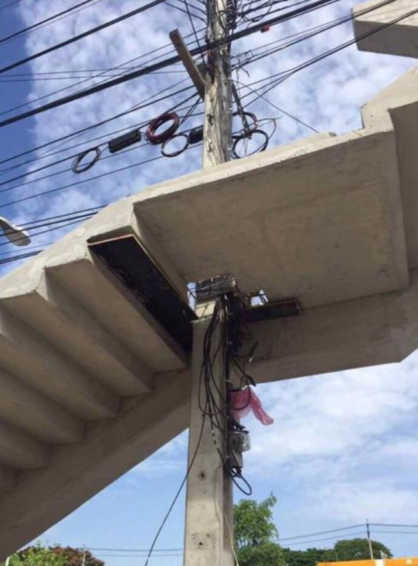 Perhaps fortunately for anyone who might have been electrocuted by the wires - just 165 centimeters from the walkway - the bridge is outside Ratchathani Ayuthaya Hospital.