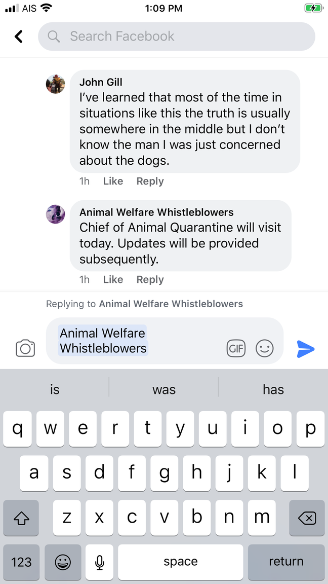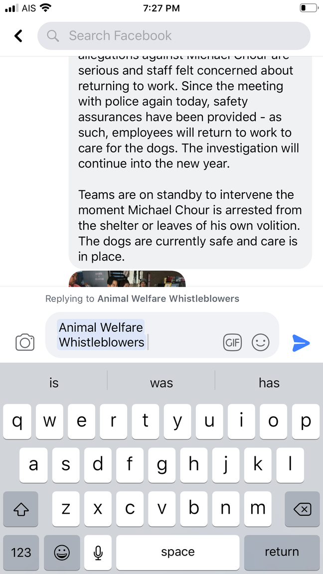Here’s a screenshot of the conversation I had with them on Facebook. They want this dude arrested and locked up and they seem more interested in that than the dogs and they are supposed to be there for the dogs that’s what I thought the “animal welfare whistle blower organization” was for but they seem more interested in sticking it to this guy.