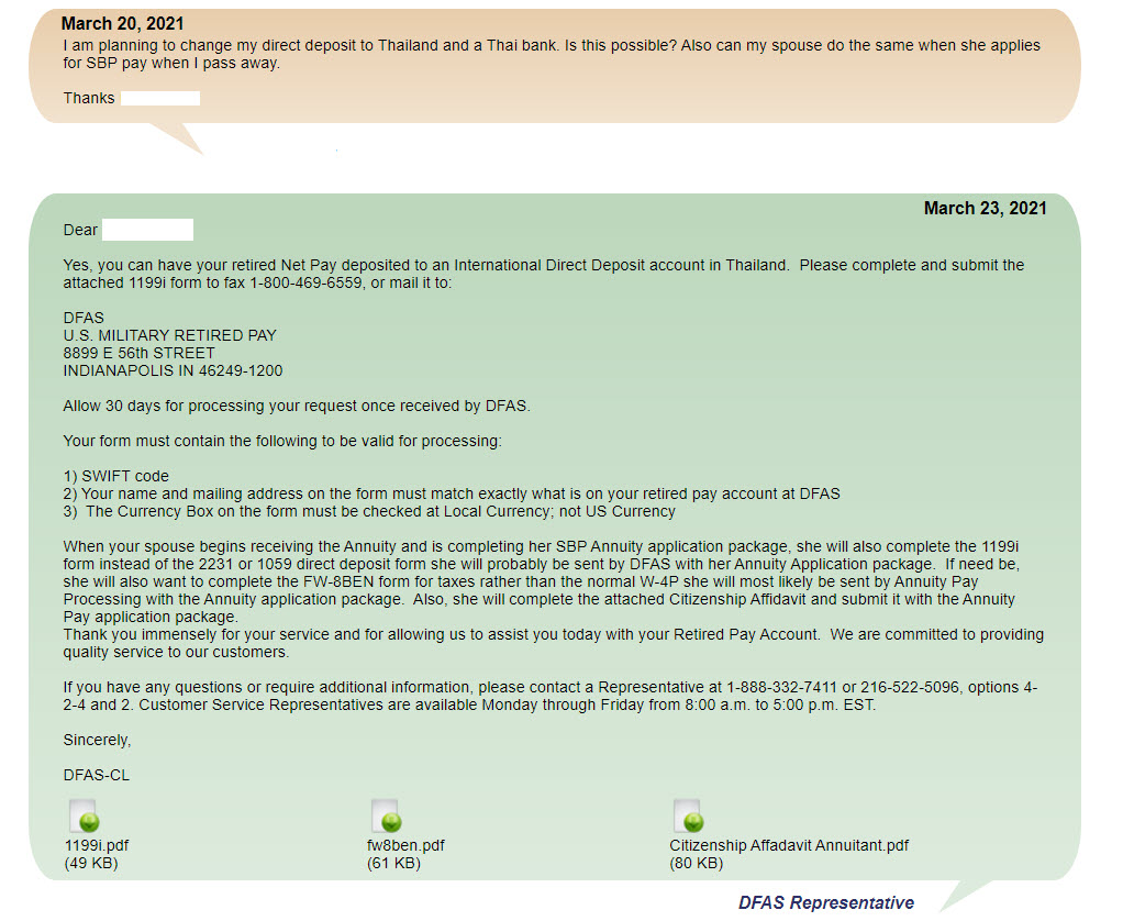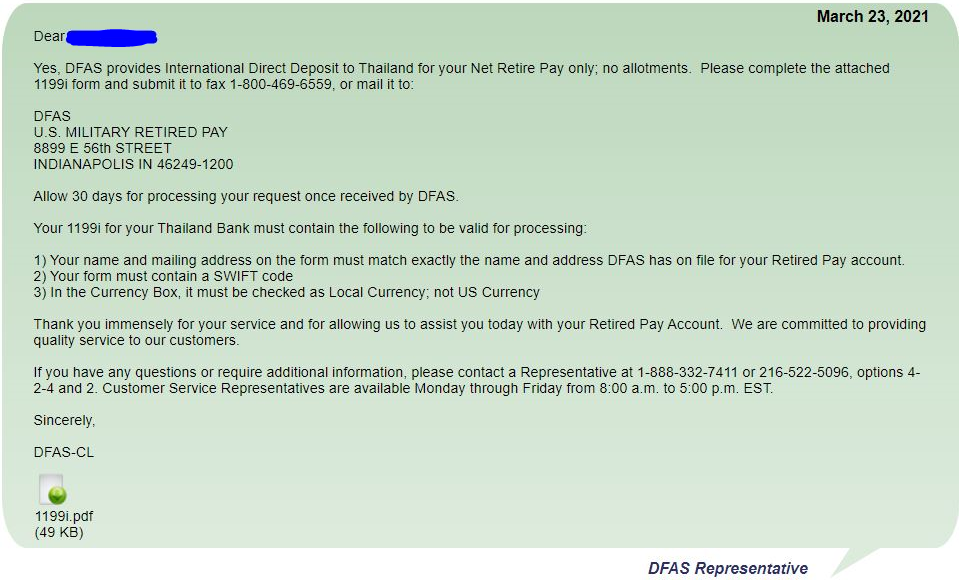 Over the weekend I sent a email ticket to DFAS regarding IDD to a Thai bank. The answer came back just today. I copied the question and answer received in a jpg attachment that I post here for all to read that have wondered about DFAS and IDD to Thailand. DFAS quite clearly says it is possible and they even went on to say what forms are needed to start the IDD.