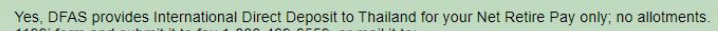 Forget to comment on one thing that may make DFAS military retirement pay to Thailand via IDD undesirable in some fine-print so to speak that a person must send Net Pay; no allotments allowed as stated in the first sentence of the DFAS reply.    I expect that is because they probably can not use the international SWIFT system to split your pay in several directions (going to different places) like they can with the U.S. ACH system.