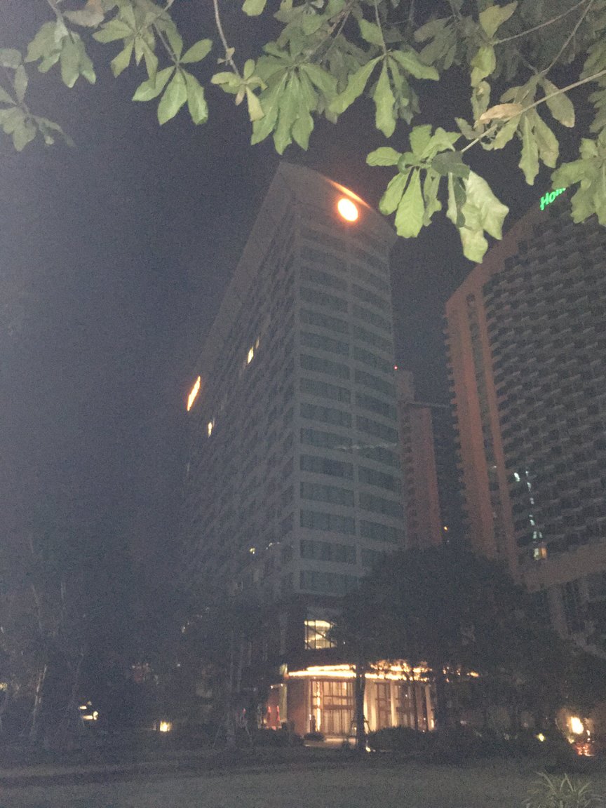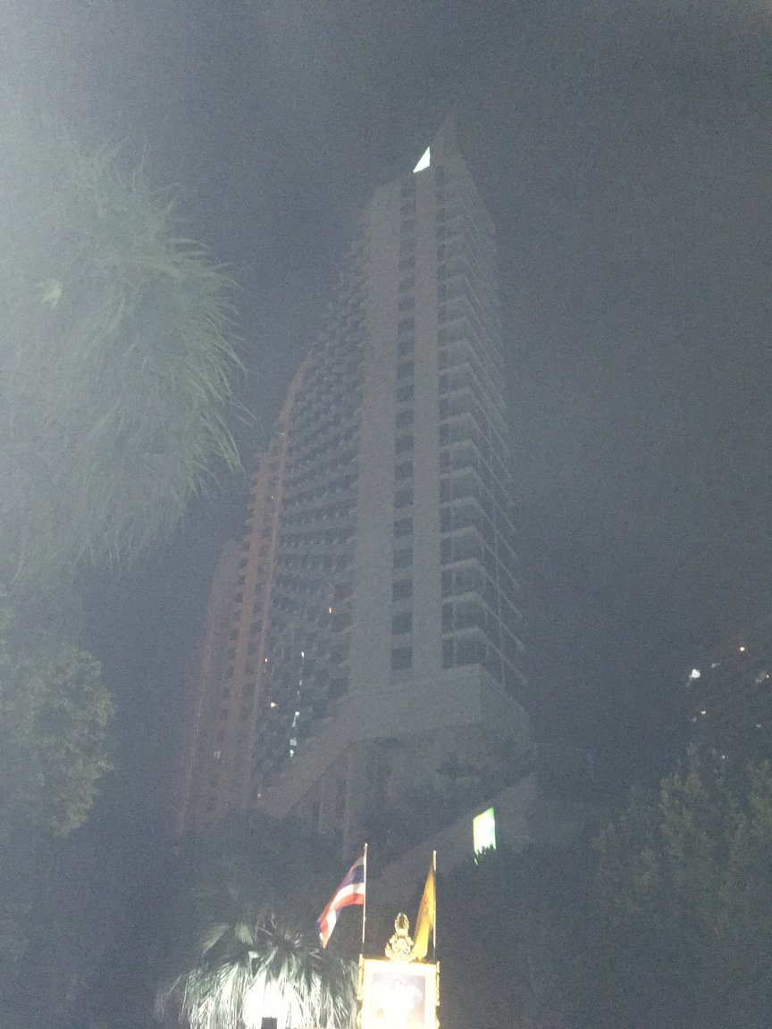 Pattaya Hilton Hotel is closed. Building was dark except for signage, stairway lights and one room light.