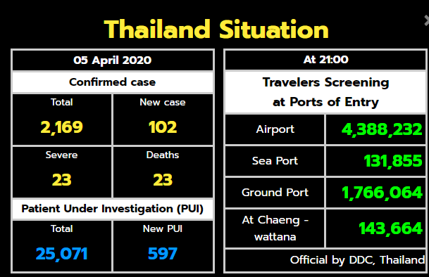 According to the daily report on the Covid-19 situation, Thailand’s total number of patients rose to 2,169, with 102 new cases confirmed over a 24-hour period and three patients, including a foreigner, dying, Taweesin Visanuyothin, spokesman of the government's Centre for Covid-19 Situation Administration, said on Sunday (April 5).