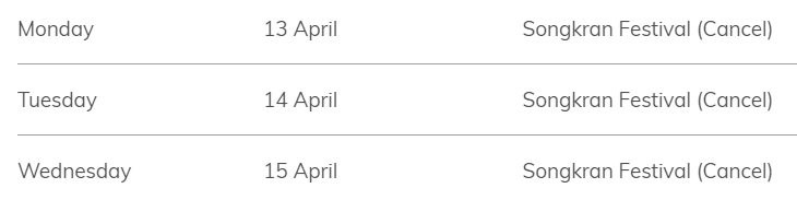 Flights to Thailand are suspended from 3 April 2020 17:00 UTC until 18 April 2020 17:00 UTC.