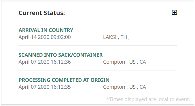 April 25, 20205 yr According to the tracking info, my package left Bangkok heading for Chiang Mai, In-Transit March 30, 2020 at 2:09 pm Departed BANGKOK, THAILAND Get Updates