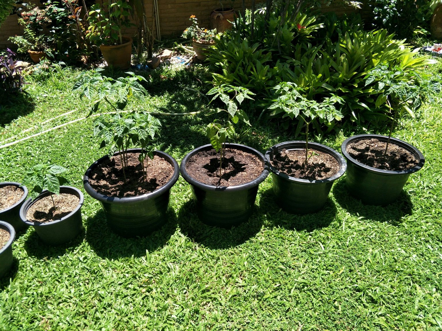 I was thinking of planting them out in the garden, but a lot of plants I've put in the soil in the past have died. Some things do well in it, others can't stand it (a lot of them develop fungus around the roots), so I'll probably get some larger pots and transplant them into those. With the rainy season coming up, it will also make it possible to move them out of the worst of the weather and try to avoid overwatering them via the rainfall. This guy says they'll do OK in pots: