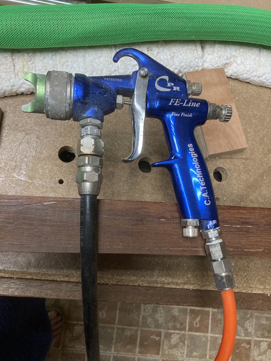 I have gravity (1.5mm) tip and smaller, 2 or 3 siphon guns 1.7 ~ 2 mm, a couple of air brushes and a pressure fed expensive gun (quite a few hundred $) with a variety of needles and tips that is on a pressure pot at the moment, most will be happy at around 20 ~30 psi and under