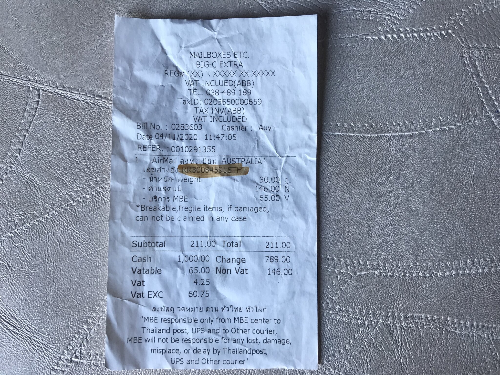 • You sent them as air mail registered, which is why you have a tracking number on your receipt. The regular fee is probably 36THB, and then 40THB extra for "registered"