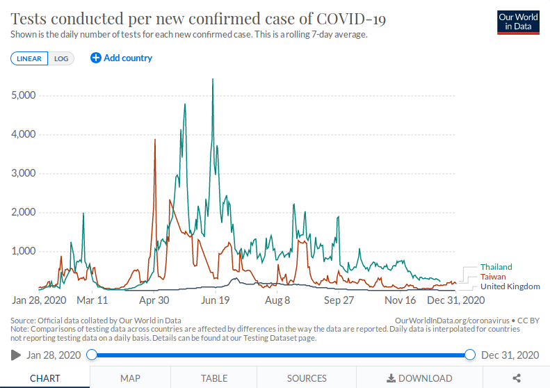 January 4, 20215 yr 33 minutes ago, rabas said: Yes. They do report internationally. According to WHO, the important factor is tests per detected case, where Thailand excels. From ourworldindata.org. Caution, heads may explode as Thailand is ahead of both the UK and Taiwan. From September 18 - Dec 13 Thailand were steady at 333 tests pr positive each day. Where are they getting those statistics from because that's a bit weird. Same with Taiwan from April - sep, or what am I missing ????