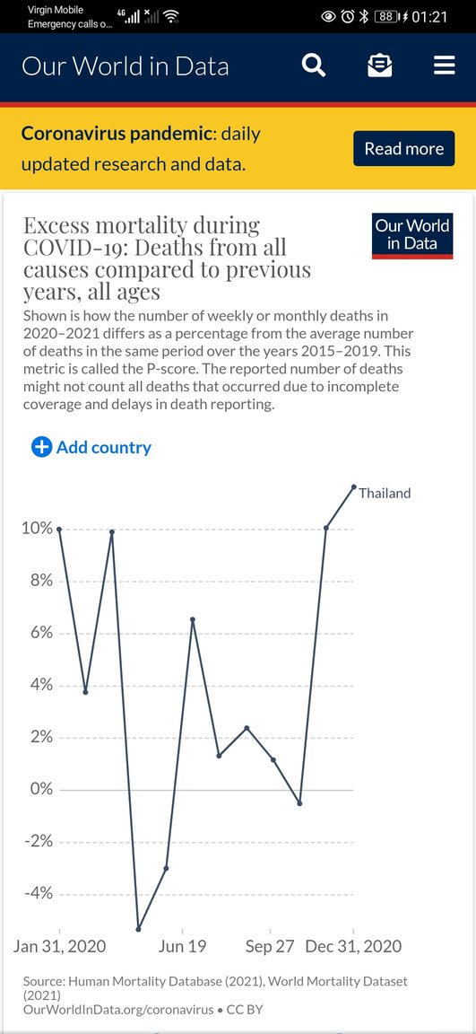 The way I read the chart is back in April, which is after traditional northern hemisphere flu season (October-March), the numbers were excessive and hint at the severity of the first wave, ie. excessive Covid-related deaths. The second wave, although just as serious is more coincident with the traditional flu season, ie. lower ratio of Covid-related deaths. Also the UK's vaccination program kicked off around mid-December so that may be impacting their CURRENT drop off. It isn't that Thailand is wishing to hide these numbers by not including them in weekly statistics, the fact is they are tracked by a different entity than the MOPH.