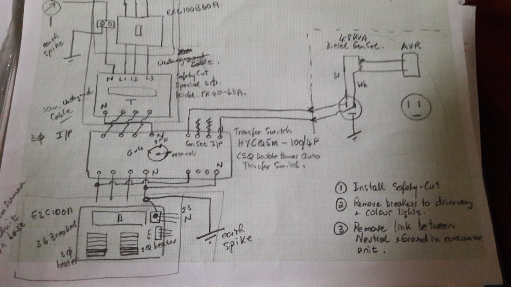 The incoming 3 phase house power comes underground from an outside CU where the mains overhead wires terminate. The underground wires come up into the transfer switch box, via 3 stabalisers. Also the generator feed and feed to the house consumer unit, which is 3 to 4 m away thru 2 cavity brick walls and the SafetyCut. All the house power is run up in conduits to a channel on top of the walls bond beam. So it's difficult to rewire from the transfer switch to the SafetyCut/