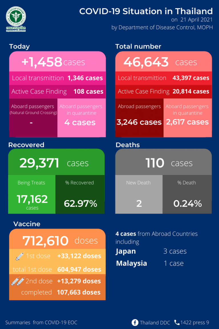 Thailand reported 1,458 new COVID-19 infections on Wednesday and 2 additional deaths.