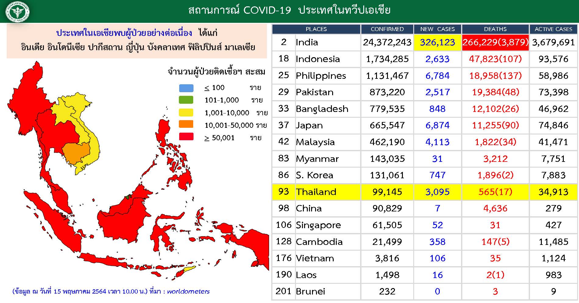 Thailand on Saturday (May 15) reported 3,095 new COVID-19 cases, and 17 additional deaths over the last 24 hours.