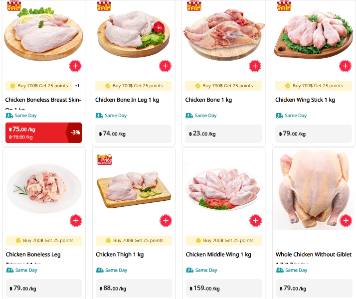 Boneless chicken breasts at 42 Bht a kilo in Bic C the other day.