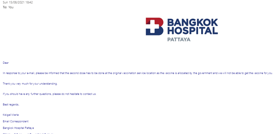 Just a quick update   I got my first vaccine jab at PhayaThai2 Hospital BBK ......... and  I sent a email to Bangkok Hospital  Pattaya asking if I could have my second Jab there instead of travelling back to BKK.