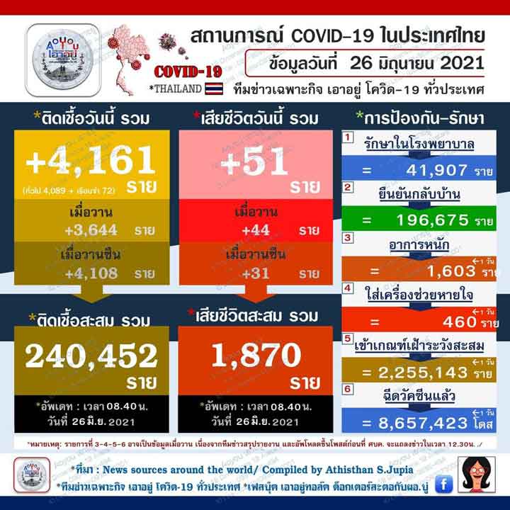 Thailand on Saturday (June 26) reported 4,161 new COVID-19 cases and 51 additional deaths over the past 24 hours.